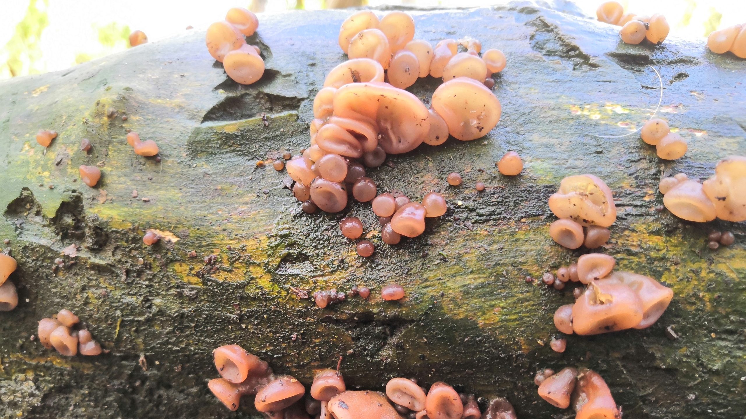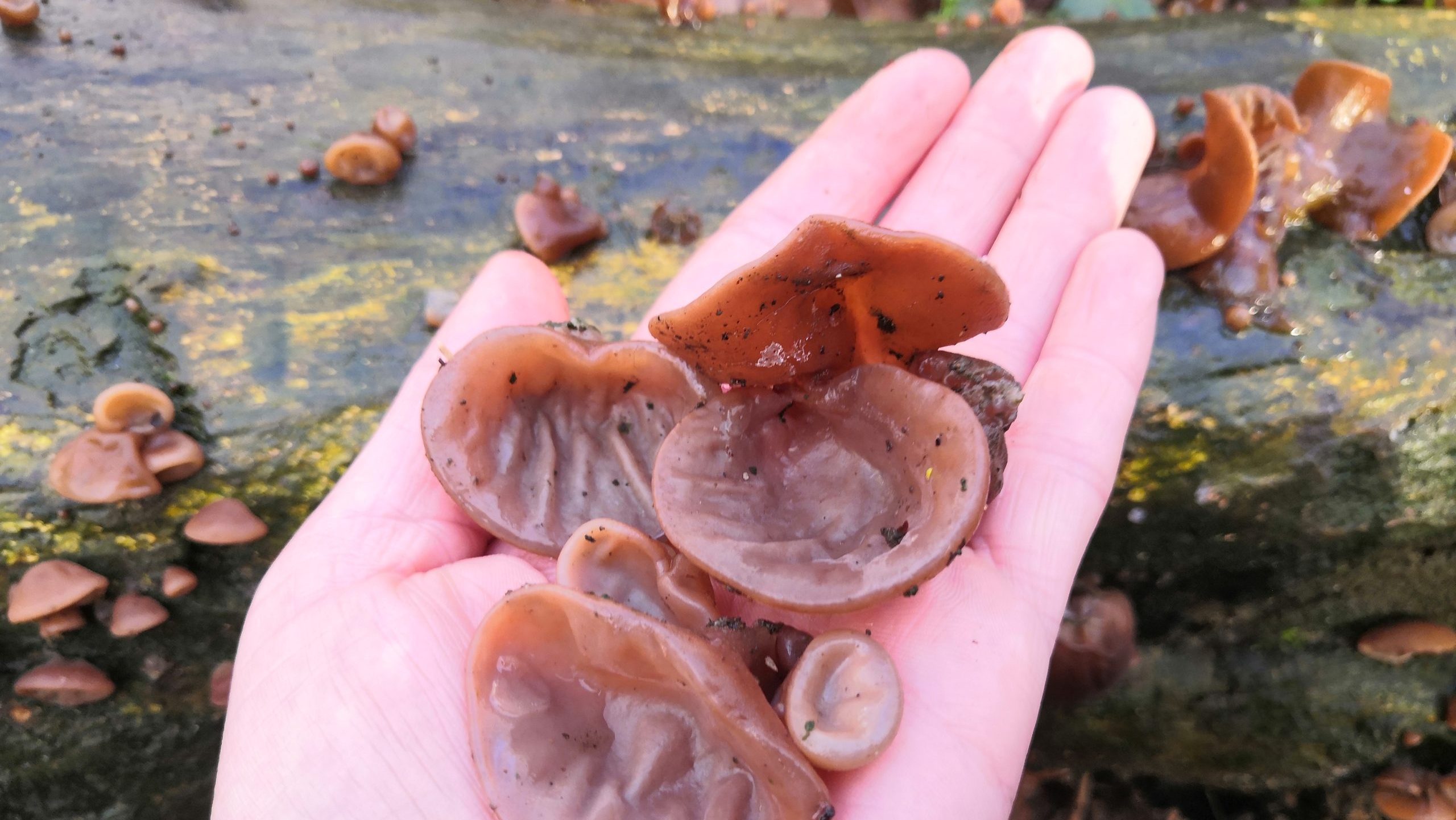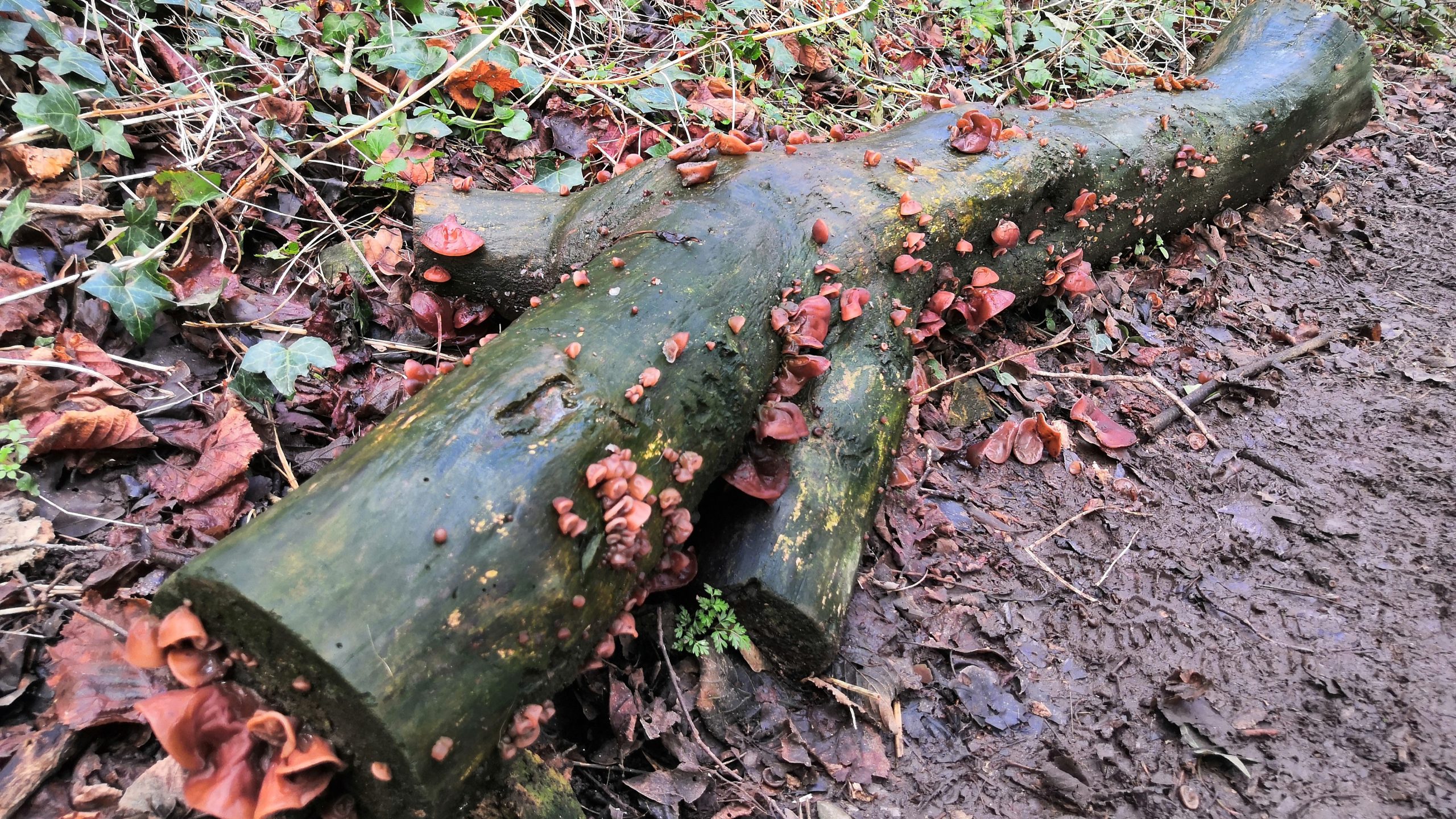 Its location has shifted a little here and there as the weather, walkers, and nosey dogs have pushed it around, but I always look out for it. This is because it is home to jelly ear mushrooms. Fungi like jelly ears are an important part of woodland cycles. They break down the old and dead wood of trees like elder, ash, beech, and sycamore, into products that go on to feed the woodland.