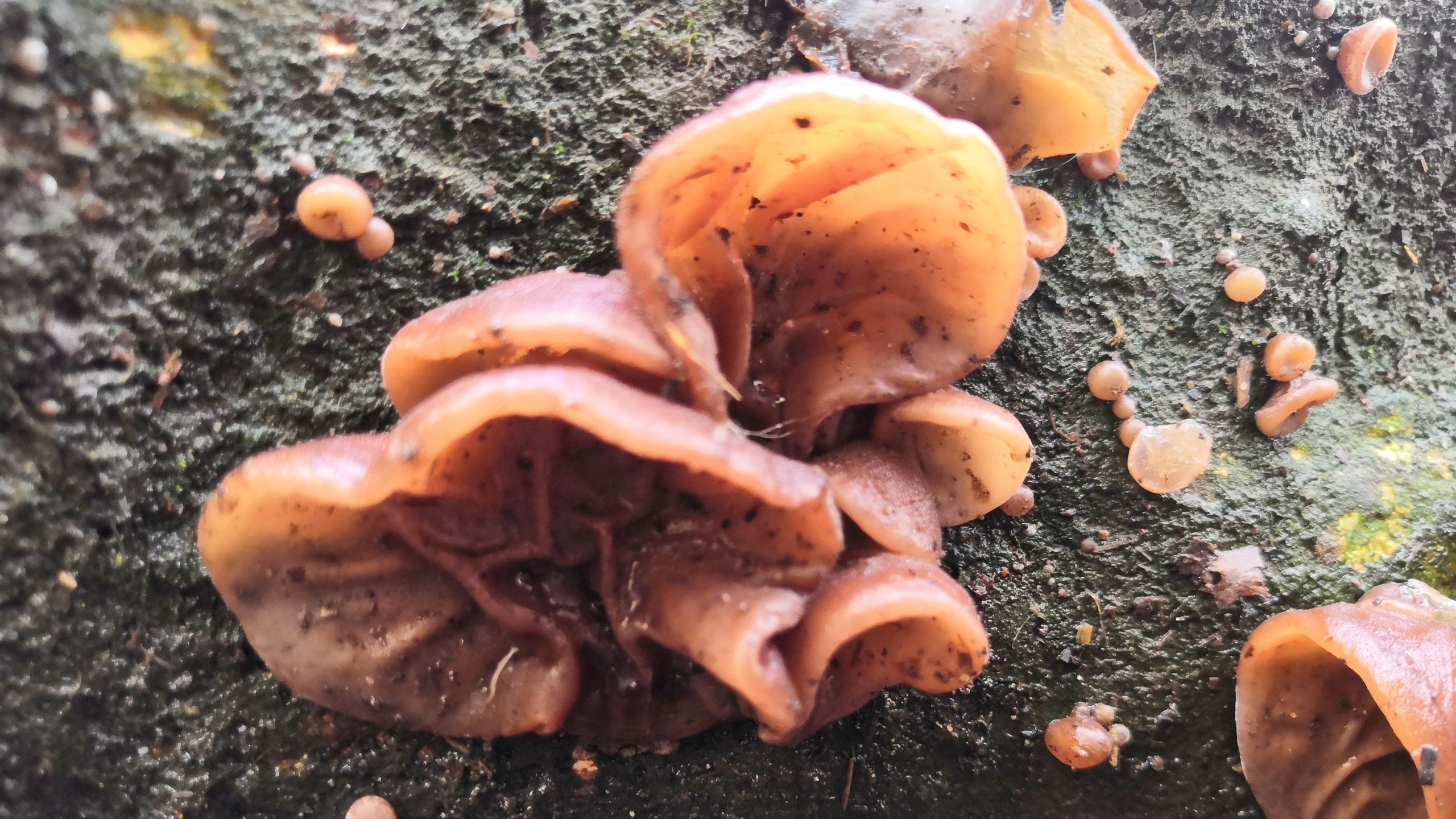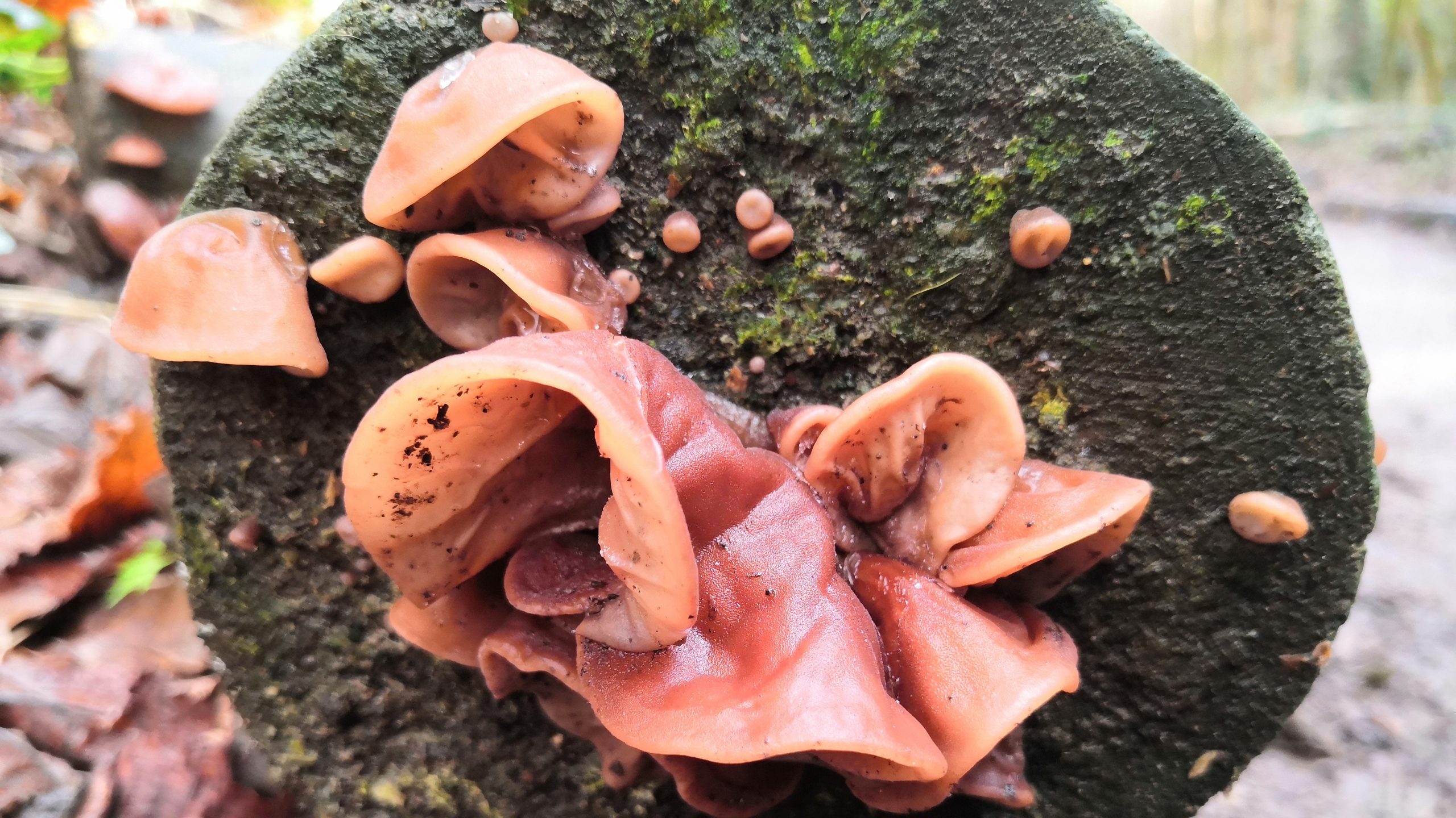 Jelly ears appear all year round but you often get flushes after summer rain and damp autumnal weather, and I always check whether they have made an appearance. Recently the log has been covered in them and as the mushrooms fall off it looks like little ears are listening to you from the woodland floor.