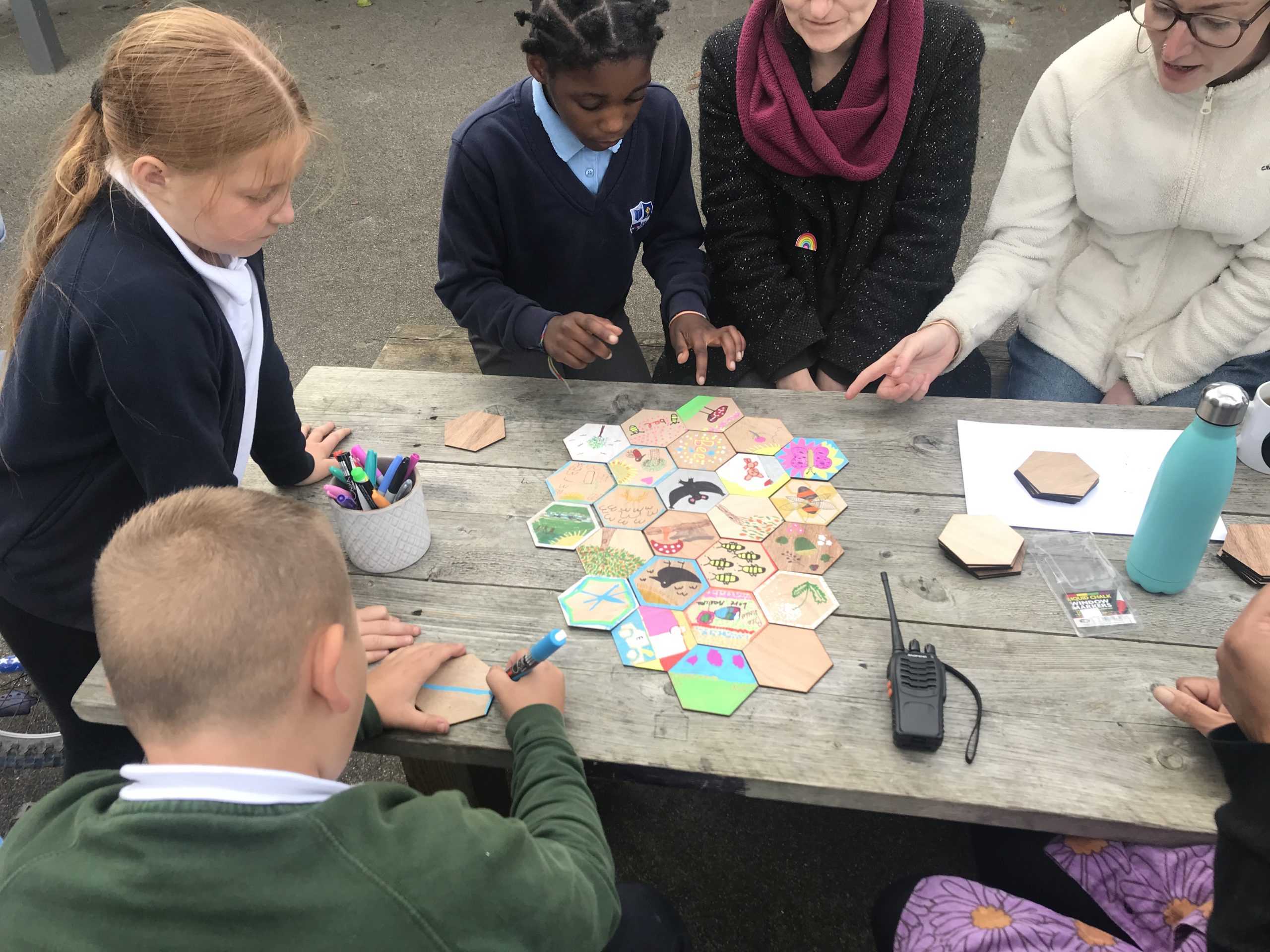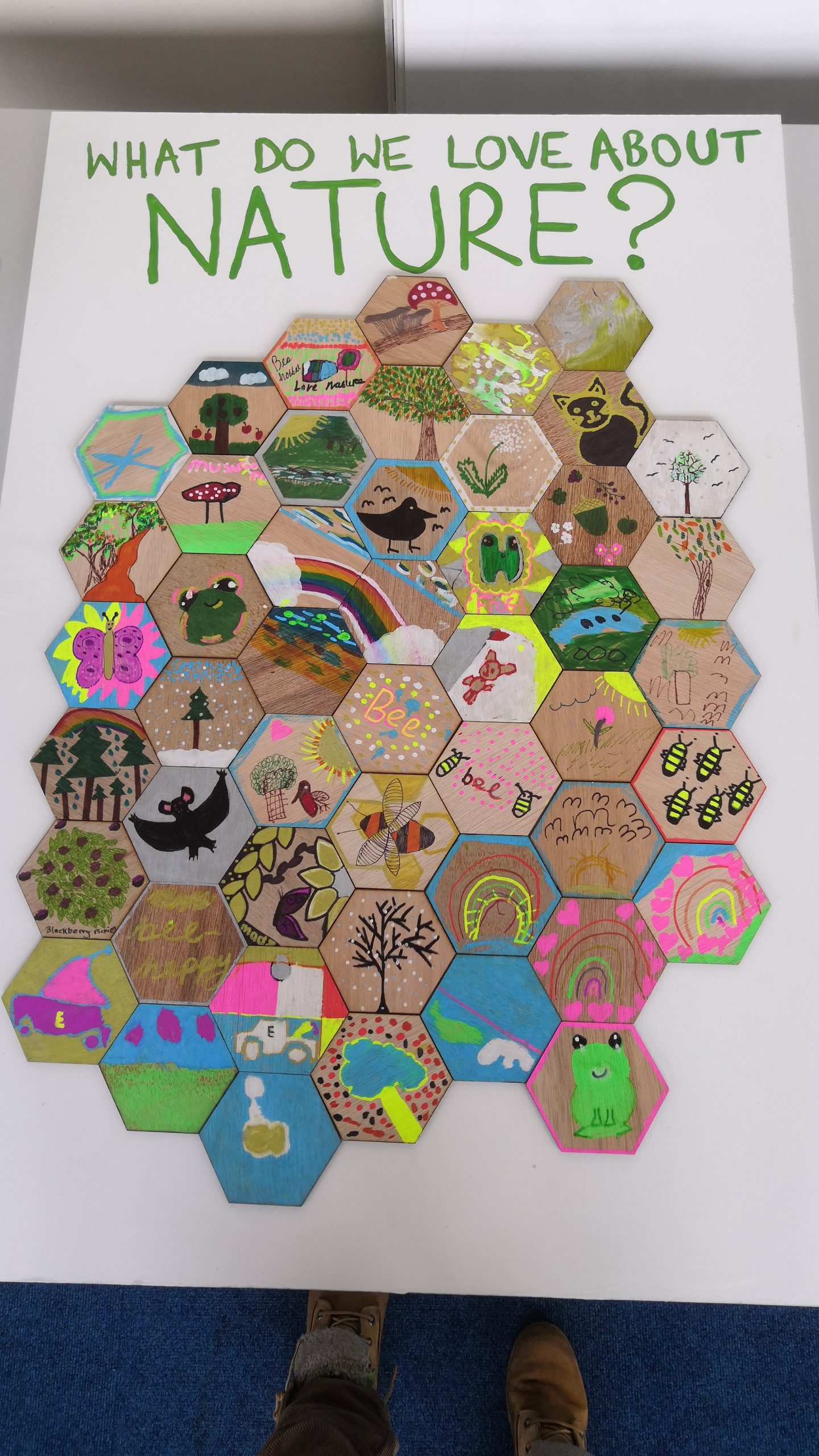 In our first workshop we painted wooden hexagons, which will slot together to make a big piece of artwork. We were discussing what we love about nature and what we’d like to do for nature in Southmead.