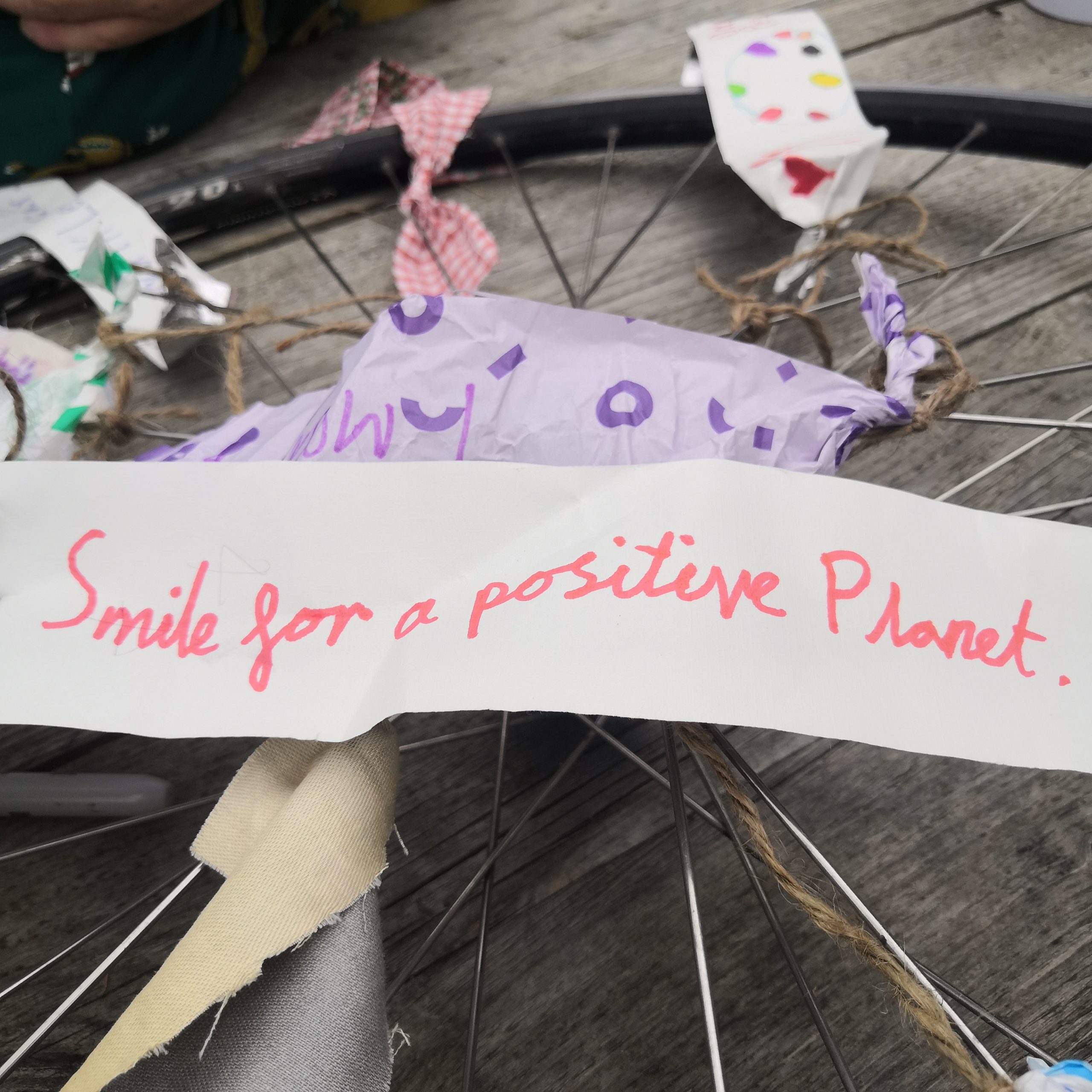 In our second workshop we made a bike wheel chandelier. All the materials, including the bike wheel, were waste materials destined for a bin or recycling box. We were answering the question ‘what could we do to be kinder to the planet?’, writing thoughts on scraps and attaching them to the wheel.